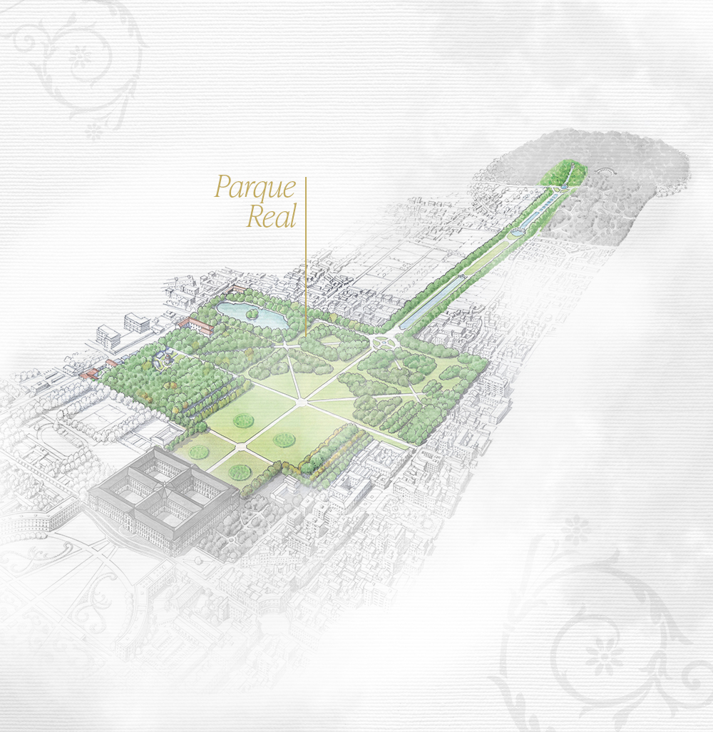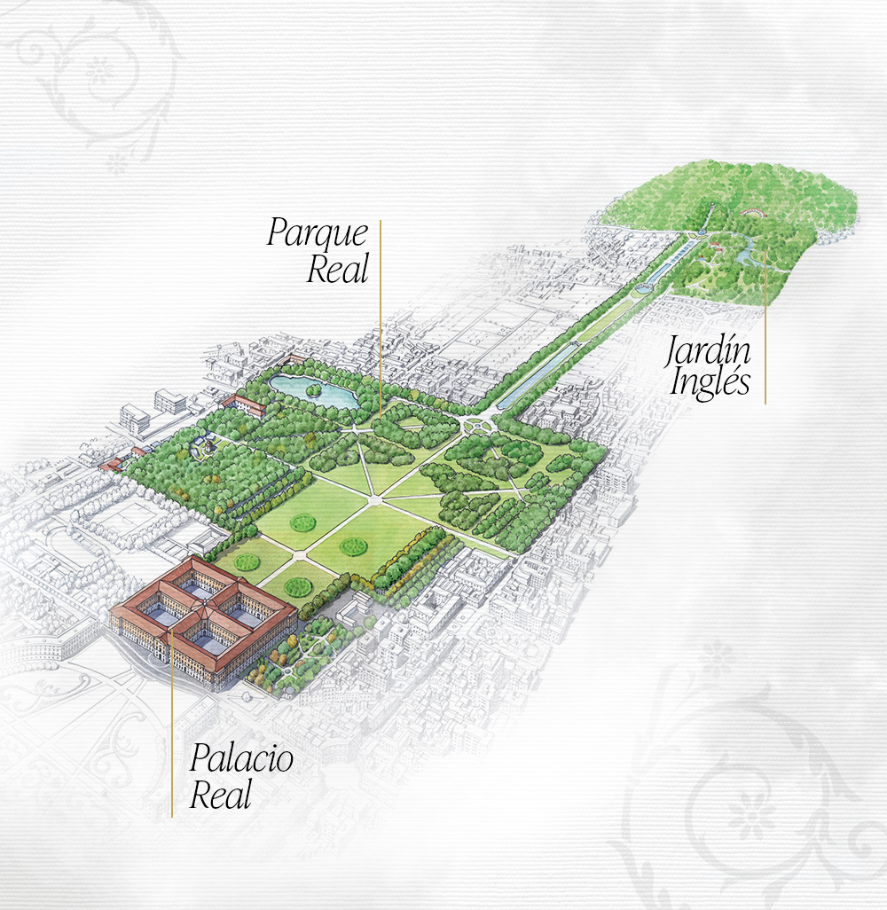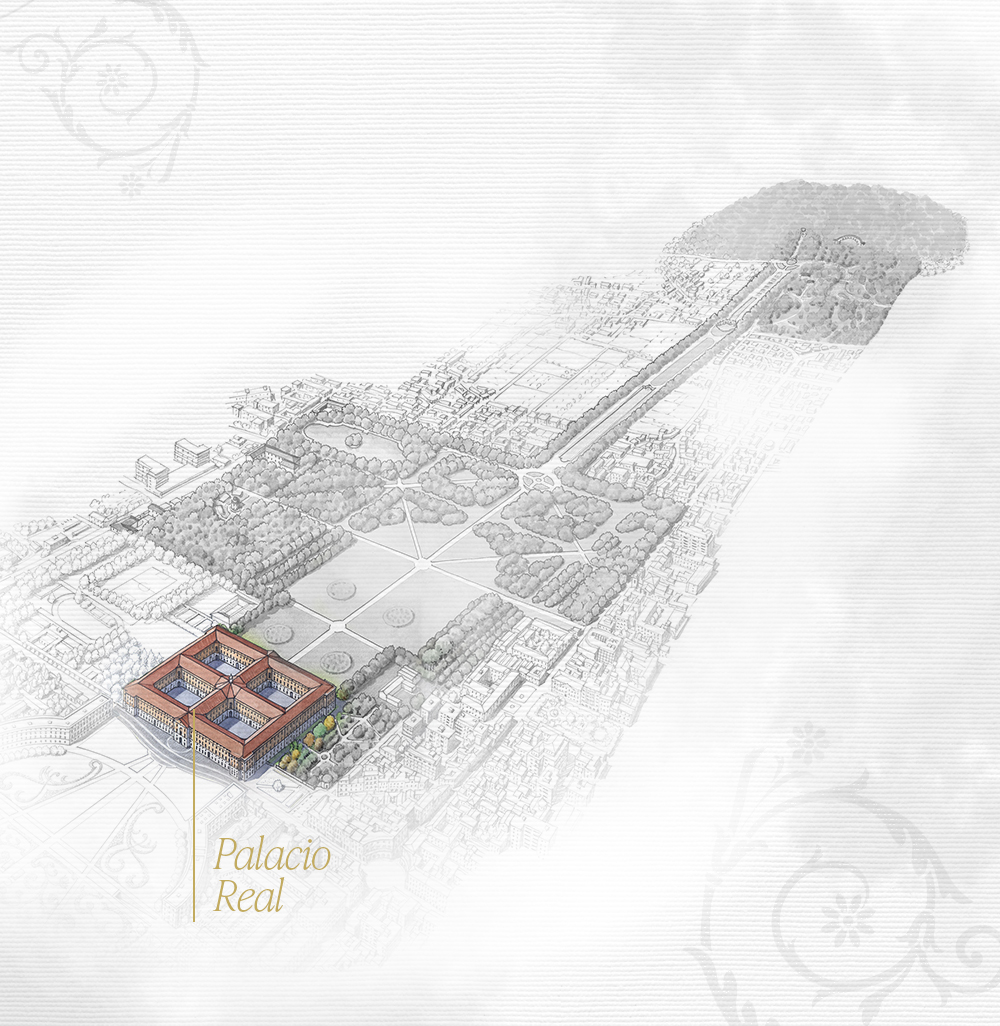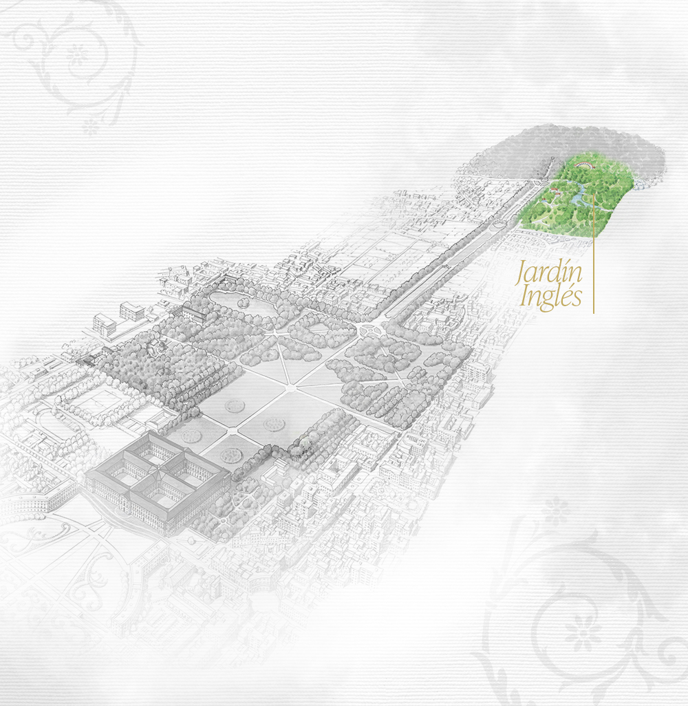 1. Vía de Agua2. Castelluccia3. Peschiera4. Fuente de los Delfines5. Fuente de Eolo6. Fuente de Ceres7. Fuente de Diana y Acteón8. Fuente de Venus y Adonis9. Cascada y Torreón10. Bosque Viejo11. Fuente Margarita12. Bosque de San Silvestro13. Acueducto Carolino