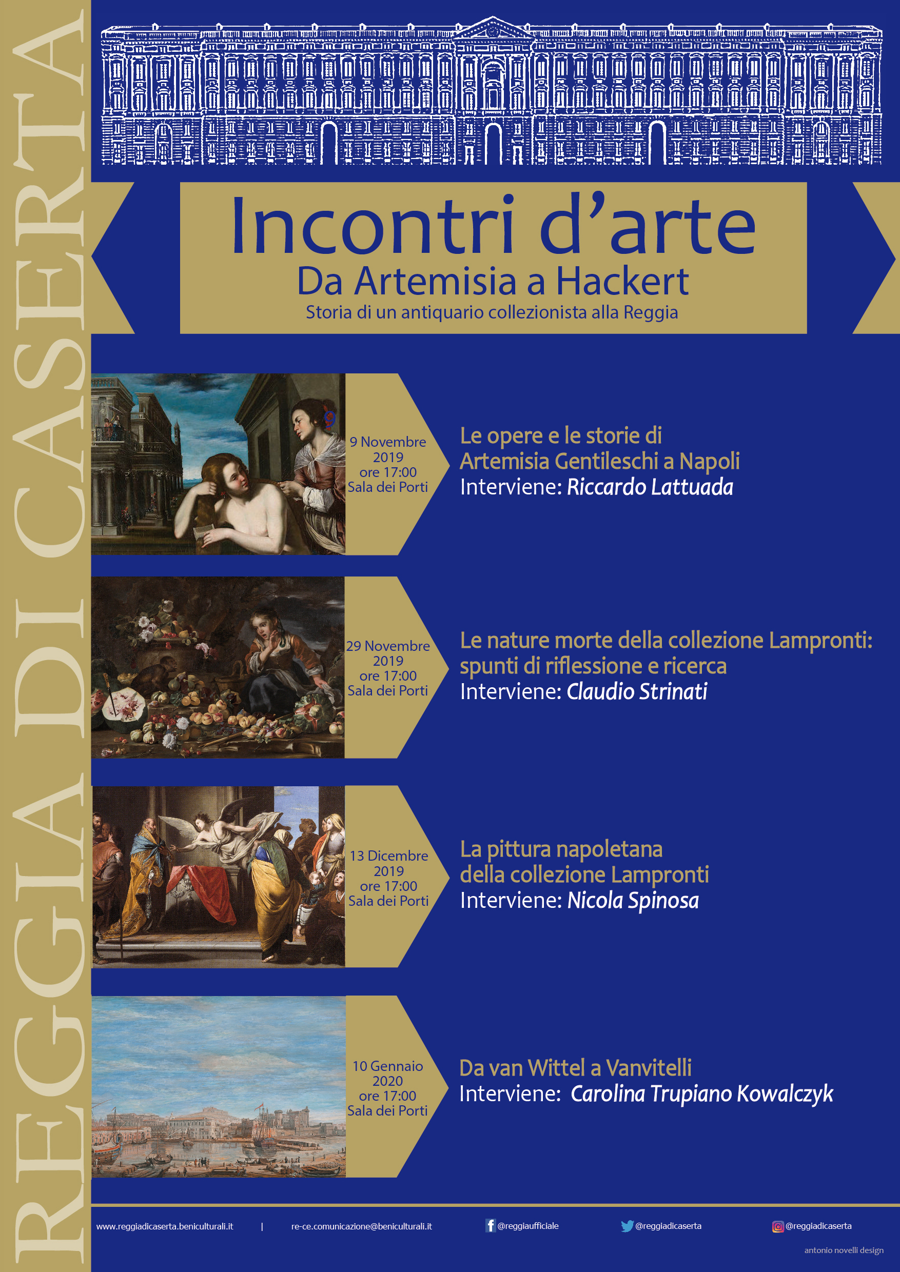 La mostra “Da Artemisia a Hackert. Storia di un antiquario collezionista alla Reggia”, ospite del Complesso vanvitelliano fino al prossimo 16 gennaio, è l’occasione per la realizzazione di quattro giornate studio, che vedranno coinvolti esperti del mondo accademico, con approfondimenti sulla collezione Lampronti.