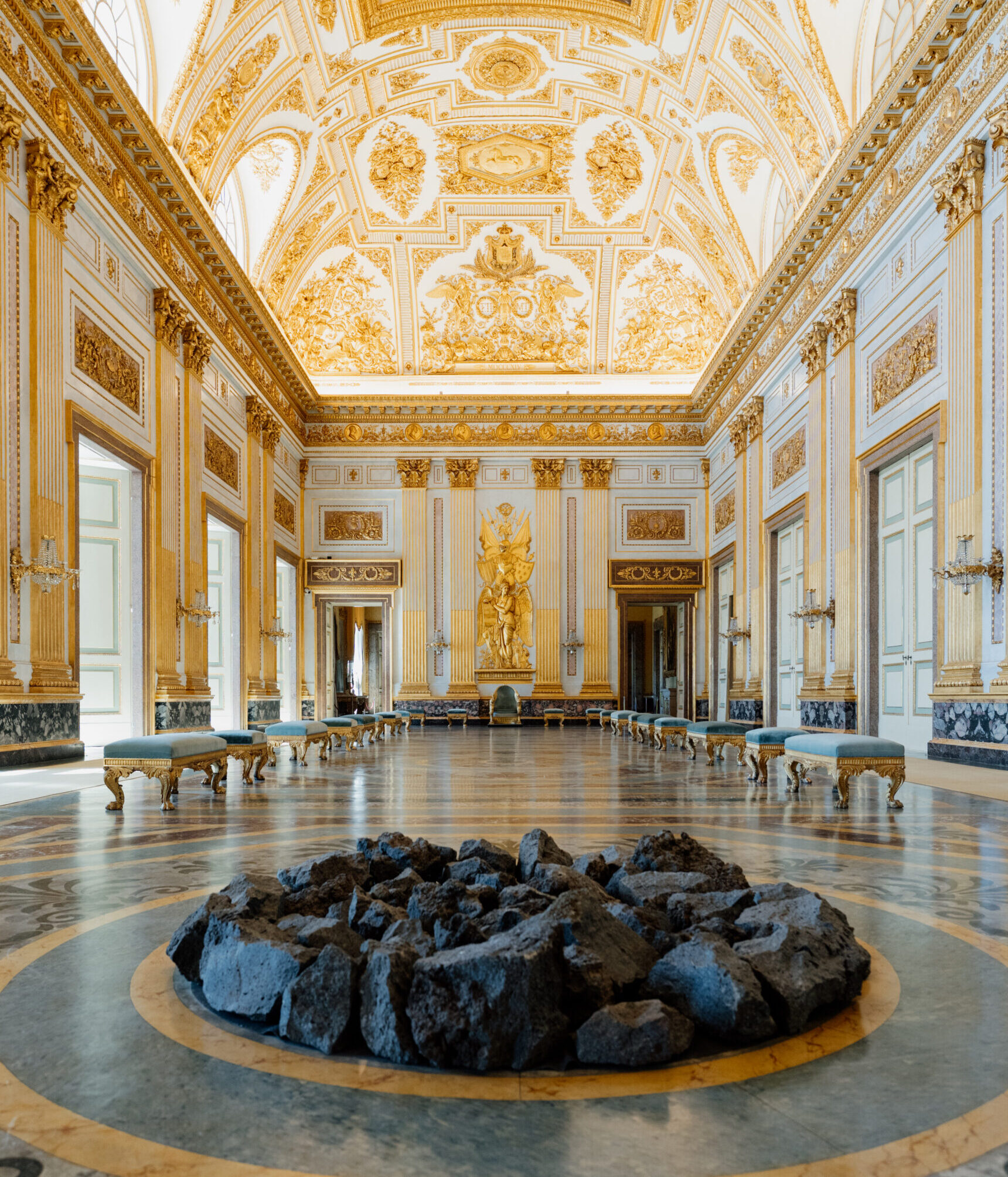 Il monumentale affresco sulla volta di Gennaro Maldarelli ricorda la posa della prima pietra del Palazzo Reale, avvenuta nel 1752.